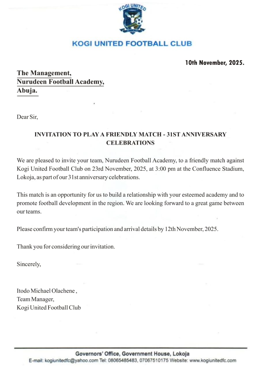 Nurudeen Football Academy is proud and delighted to confirm that we have formally accepted the prestigious invitation from Kogi United Football Club to play a high-profile friendly match as part of their 31st Anniversary celebrations.