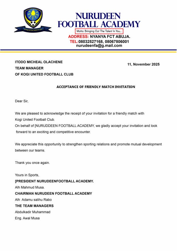 βOn behalf of NURUDDEEN FOOTBALL ACADEMY, we gladly accept your invitation and look forward to an exciting and competitive encounter.β